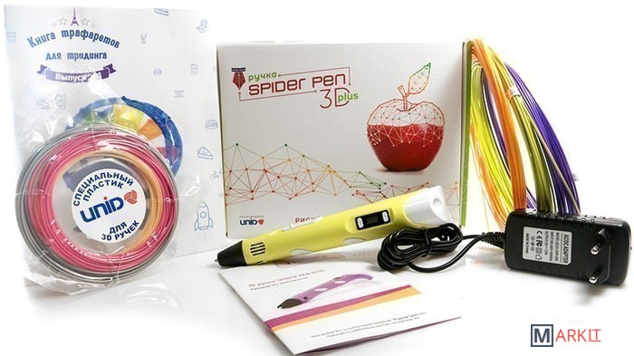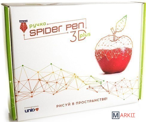 | Комплектация | - 3D ручка Spider Pen PLUS;- Блок питания;- Демо-комплект пластика 10 метров ABS;- Промо-комплект пластика 30 метров PLA;- Инструкция на русском языке$- Книга трафаретов. |