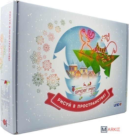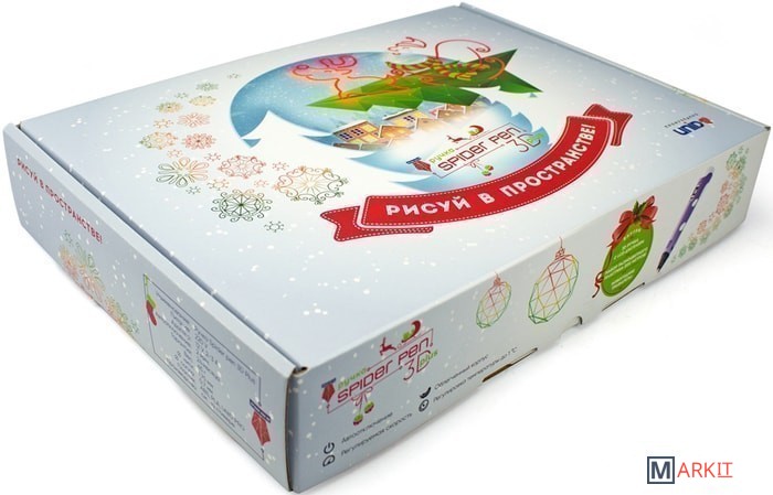 Комплектация - 3D ручка Spider Pen PLUS;- Книга трафаретов с новогодней тематикой;- 10 цветов пластика PLA (в том числе, светящийся в темноте);- Адаптер питания;- Подарочная красочная упаковка;- Инструкция.