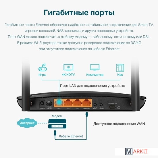 Общий доступ к сети 4G LTE для множества Wi-Fi устройств - скорость загрузки до 150 Мбит/сМощные встроенные антенны обеспечивают стабильное подключение к Wi-Fi и широкое покрытиеНе требует настройки - вставьте SIM-карту и включите маршрутизатор для высокоскоростного доступа в интернетПозволяет одновременно создавать две сети Wi‑Fi со скоростью до 300 Мбит/с на 2,4 ГГц и 433 Мбит/с на 5 ГГцРезервное подключение по 3G/4G при отсутствии подключения по кабелю EthernetПоддержка OneMesh — используйте усилители OneMesh, чтобы создать покрытие во всём доме и не терять сигнал при перемещении