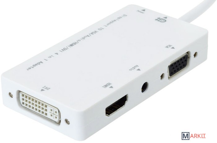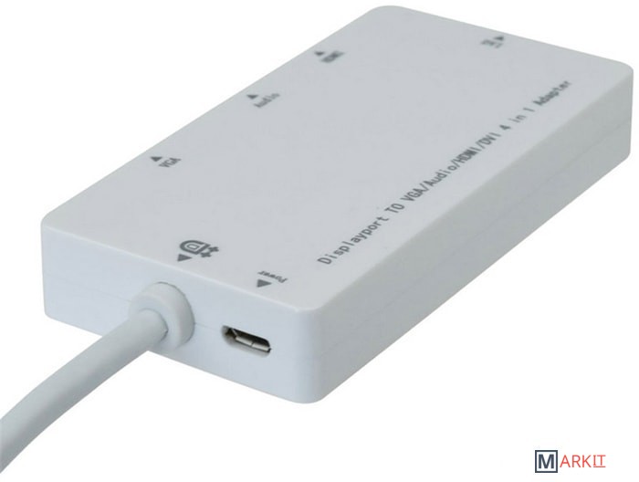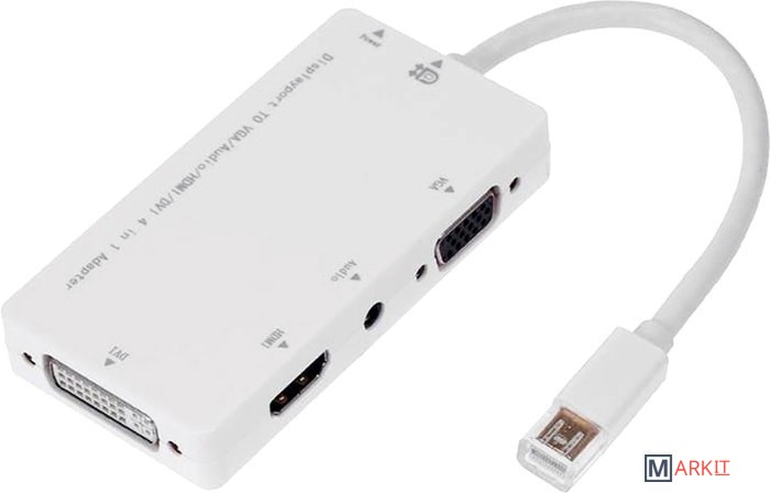 Кабель-переходник для подключения монитора или телевизора с интерфейсами HDMI/DVI/VGA к ноутбуку или видеокарте с выходом Mini DisplayPort. Доступен аудиовыход. Может понадобиться использование внешнего БП, если не хватит мощности, предоставляемой DP портом.