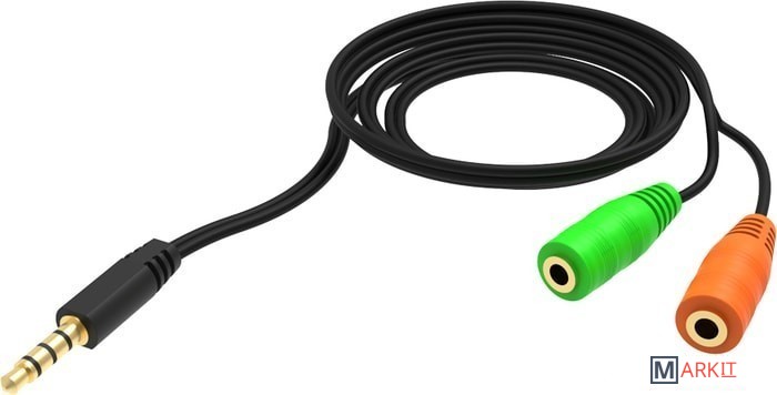 Аудио-переходник для подключения компьютерных гарнитур с двумя jack 3,5 мм (или микрофона и наушников) к устройству с совмещённым разъёмом jack 3,5 мм 4pin.