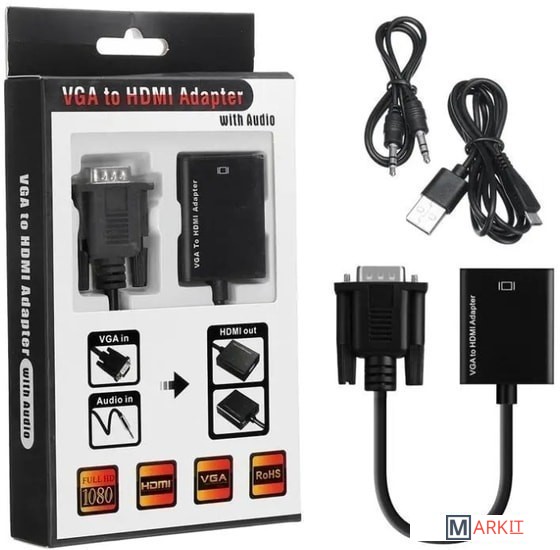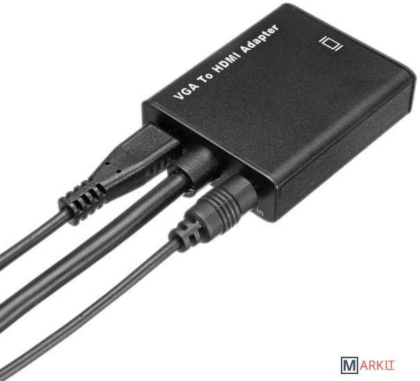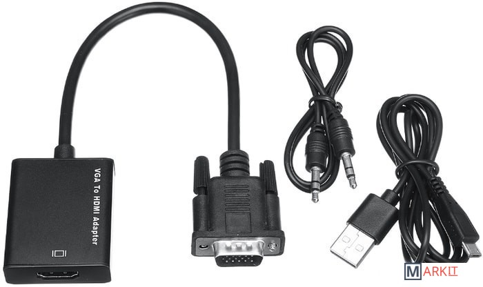 Адаптер / переходник / конвертер / преобразователь VGA на HDMI – конвертирует аналоговый VGA сигнал в цифровой HDMI сигнал (только в этом направлении), поможет подключить компьютер, ноутбук, DVD-плеер, игровую консоль с выходом VGA к телевизору, проектору, монитору со входом HDMI. Также адаптер позволяет дублировать или расширить пространство рабочего стола Вашего ПК или ноутбука на дополнительный монитор, телевизор, проектор. Версия PRO+ имеет преимущества – металлический корпус, удобное решение (для многих ситуаций) – встроенный кабель VGA и гнездо jack 3.5mm (кабель в комплекте). Максимально поддерживаемое разрешение FullHD 1920×1080 60Гц