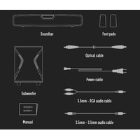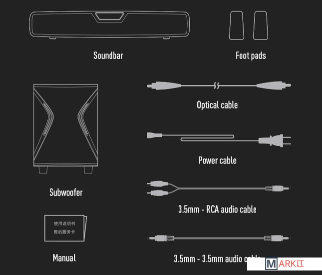 - аудиокабель (2RCA - 3.5 мм)- аудиокабель (3.5 мм - 3.5 мм)- оптический кабель- кабель питания |