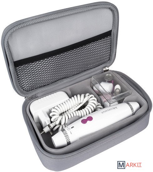 | Комплектация | Насадки: - сапфировый диск (мелкозернистый); -сапфировый конус (крупнозернистый); - войлочный конус; - фреза для ногтей; - цилиндрическая фреза; - факельная фреза; - полировщик с насадками. |