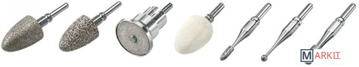| Комплектация | Крупнозернистая конусная сапфировая насадка. Мелкозернистая конусная сапфировая насадка. Войлочный конус. Сапфировая фреза "пламя". Круглая сапфировая фреза. Цилиндрическая сапфировая фреза. Мелкозернистый сапфировый диск. |