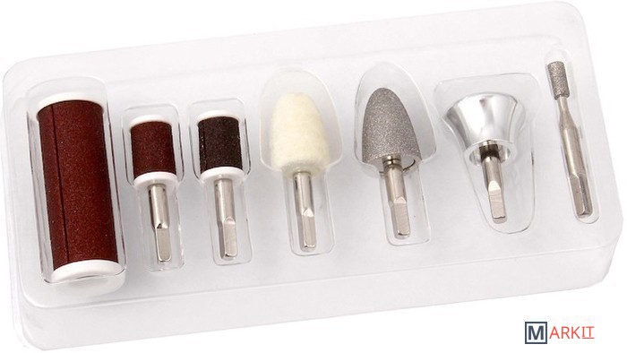 | Комплектация | Большой ролик с крупным напылением.Большой ролик с мелким напылением. Малый ролик с крупным напылением. Малый ролик с мелким напылением. Шлифовальный диск. Конусная насадка. Войлочная конусная насадка. Тонкая цилиндрическая насадка. |