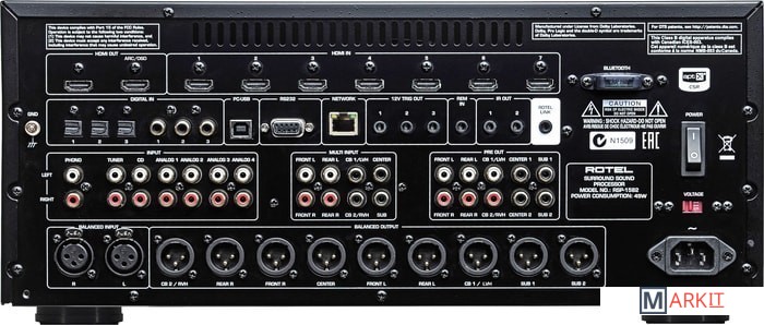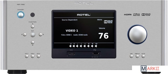 7.1-канальный флагманский AV-процессор Rotel RSP-1582 пришел на смену модели RSP-1580.Аппарат получил 7-дюймовый TFT-дисплей, установленный в центре его фронтальной алюминиевой панели. С его помощью можно выполнить все необходимые аудио/видео-настройки без использования внешнего экрана. Ниже имеется вход HDMI с поддержкой сквозного пропуска видео в разрешении 4K и USB-порт, совместимый с устройствами Apple. Слева от дисплея находятся крестообразно расположенные кнопки навигации по меню, клавиша питания/standby с LED-подсветкой, селектор входов, кнопка меню и др. Справа установлен регулятор громкости с шагом в 0,5 дБ и три функциональные кнопки.Модель Rotel RSP-1582 оснащена шестью ЦАПами Wolfson WM8740 (24 бит/192 кГц) – четырьмя отдельными чипами для центрального, фронтальных каналов и сабвуфера, а также двумя чипами для каналов окружающего звучания. Для работы с многоканальными звуковыми дорожками используется сигнальный процессор Texas Instruments Aureus TMS320DA808 с 10-полосным параметрическим эквалайзером. Присутствует аналогово-цифровой преобразователь TI PCM1804. Доступны основные форматы окружающего звучания, а также Dolby TrueHD и DTS HD Master Audio. На данном этапе не поддерживаются новейшие Dolby Atmos и DTS:X, но в будущем с выходом новой прошивки такая возможность появится. Встроенный Bluetooth-приемник с кодеком aptX позволяет обеспечить качественное звучание аудио, полученного с мобильных устройств. Имеется функция Bypass для обхода контуров обработки сигналов с целью получения чистого аналогового саунда (стерео).