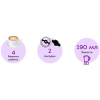 | Режимы приготовления | вспенивание холодного молока, вспенивание горячего молока, подогрев молока (смешивание с подогревом и без) |
