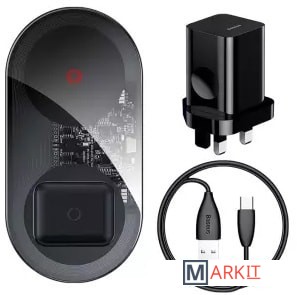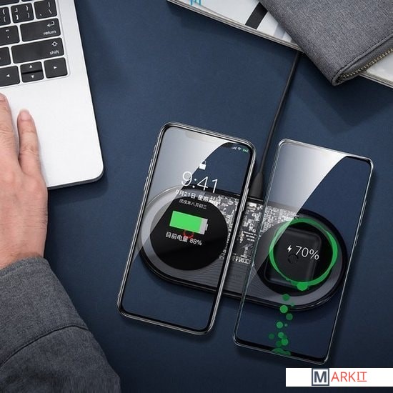 Беспроводное зарядное устройства для двух портативных девайсов, например смартфона и наушников. Оно имеет компактный корпус, который не займет много пространства. Поддержка функции быстрой зарядки. Максимальная выходная мощность устройства достигает 20 Вт.В комплект поставки входит:- беспроводное зарядное устройство (вилка не европейского образца, CN);- сетевое зарядное устройство;- кабель USB Type-C;- документация.
