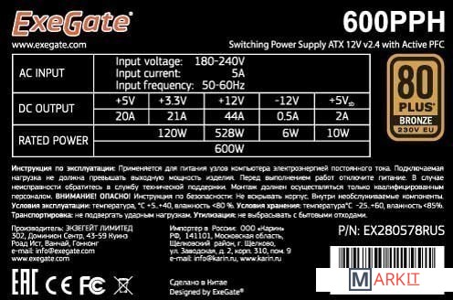 Markit » Блоки питания » Блок питания ExeGate 700PPH 80 Plus Bronze EX282154RUS