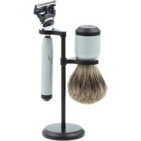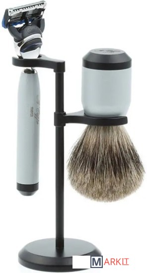 Бритвенный станок, совместимый с кассетами Gillette Fusion (одна кассета в комплекте).Помазок с барсучьим ворсом.Подставка из металлического сплава.