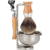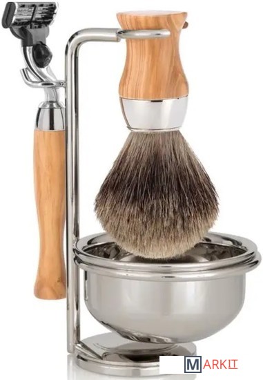 Набор из коллекции HERITAGE с помазком Tasso Tec / Best Badger из натурального барсучьего волоса, станок Gillette Mach 3 Turbо и чаша. Материал — традиционное оливковое дерево.