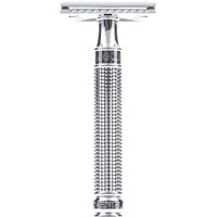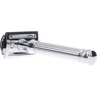Классическая Т-образная бритва Edwin Jagger с закрытым гребнем. Сделана из хромированной латуни. Ручка имеет рельефную поверхность, выполненную в стиле 3D Diamond — уникальной технологии Edwin Jagger. Такая поверхность обеспечивает отличное сцепление бритвы с мокрой рукой. Станок среднего размера.В комплект входит одно бесплатное лезвие Feather.