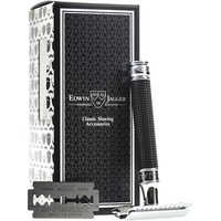 Классическая Т-образная бритва Edwin Jagger с закрытым гребнем. Сделана из хромированной латуни. Ручка выполнена в черном цвете. В комплект входит одно бесплатное лезвие Feather. Ручка выполнена в элегантном черном цвете, а также имеет рельефную поверхность, выполненную в стиле 3D Diamond — уникальной технологии «Edwin Jagger». Такая поверхность обеспечивает отличное сцепление бритвы с мокрой рукой. Станок среднего размера. Общая длина бритвы 9,3 см. Длина ручки 8,5 см.