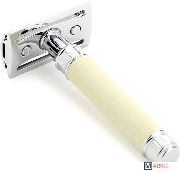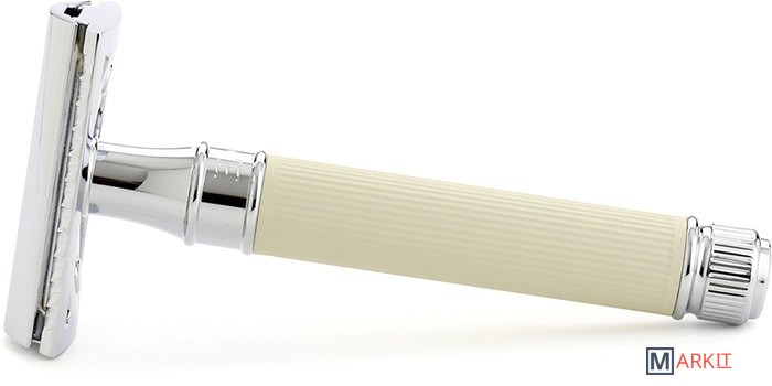 Для тех, кто ищет идеального сцепления бритвы, даже с влажной рукой. Резиновое покрытие на рукоятке бритвы изготовлено в элегантном цвете слоновой кости. Классическая бритва на лезвия с закрытым гребнем высокого качества. Хромированные элементы придают особый шарм. В комплект входит одно бесплатное лезвие Feather.
