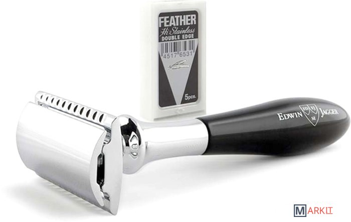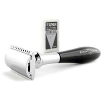 Традиционный Т-образный станок с акриловой ручкой цвета черной смолы. Бритва с закрытым гребнем и состоит из трех частей. Хромированные элементы украшают бритву и делают ее не только желанным аксессуаром, но и превосходным подарком. Бритва предназначена для ежедневного бритья. Долговечность бритвы позволит сэкономить на бритье не одну тысячу рублей. Вес 74 гр., длина ручки 10 см. Поставляется в подарочной фирменной упаковке. 5 лезвий Feather Hi-Stainless в комплекте.