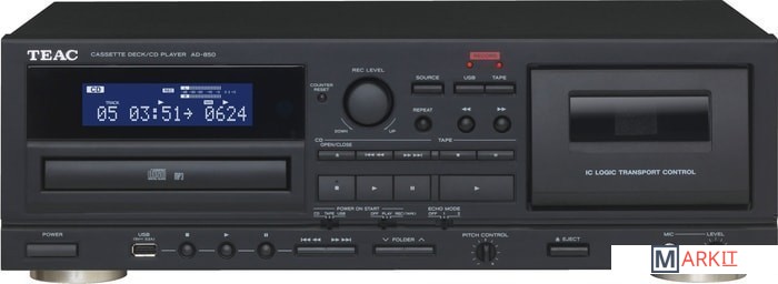 Комбинированное устройство TEAC AD-850, выполненное в классическом для Hi-Fi-техники форм-факторе, объединяет в одном корпусе проигрыватель CD-Audio и кассетную деку. Этот аппарат способен удовлетворить запросам многих меломанов, которые бы хотели приобщится к популярному в 80-е годы формату аналоговой магнитной записи, а также тех, кто еще имеет в своем распоряжением компакт-кассеты с музыкальными записями.Однако на этом возможности TEAC AD-850 не заканчиваются. Аппарат оснащен также USB-разъемом, с помощью которого можно производить оцифровку композиций, имеющихся на компакт-кассетах и их запись на подключенный флеш-накопитель. Кассетная панель в TEAC AD-850 также пишущая, позволяющая записывать музыку с CD или USB-накопителей. Очень интересной дополнительной опцией в устройстве является гнездо для подключения микрофона. Для него в плеере можно включить режим реверберации (эха), благодаря чему аппарат превращается в настоящую караоке-машину. Предусмотрен в TEAC AD-850 и линейный аналоговый вход.Двухголовочная кассетная дека может работать с лентой трех основных типов, имеет точную регулировку скорости и удобное управление всеми транспортными функциями. USB-гнездо в TEAC AD-850 предназначено не только для записи, но и воспроизведения музыкальных файлы. Подмешивание микрофонного сигнала в режиме воспроизведения возможно к любому из трех встроенных источников сигнала, а запись возможна во всех случаях кроме режима копирования с CD на USB-флешку. Также в режиме записи на касссету можно воспользоваться ручной регулировкой уровня сигнала.