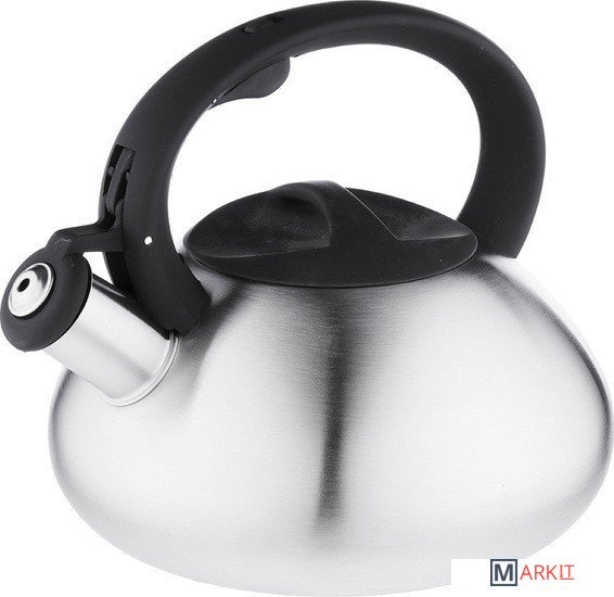 Чайник объемом 2,5 л изготовлен из нержавеющей стали, зеркальный, с несъемным свистком на кнопке и бакелитовой ручкой черного цвета подходит для всех типов плит, включая индукцию.