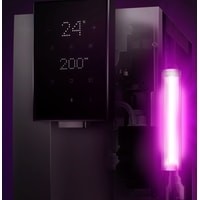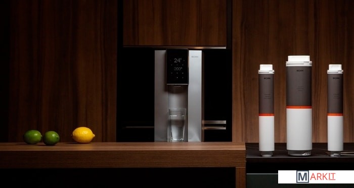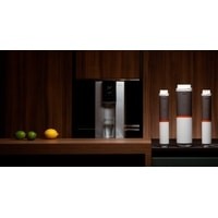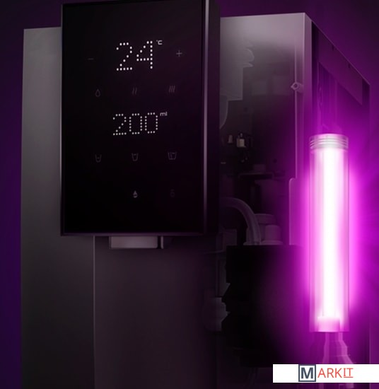 Предварительный фильтр задерживает ржавчину и песок, угольный — хлор и бактерии. Далее самый эффективный фильтр обратного осмоса устраняет все мельчайшие частицы размером от 0,001 микрон. После этого фильтр доминерализации возвращает воде приятный вкус. О необходимости замены аксессуаров сообщат индикаторы на дисплее. Установка каждого нового фильтра займёт 10 секунд