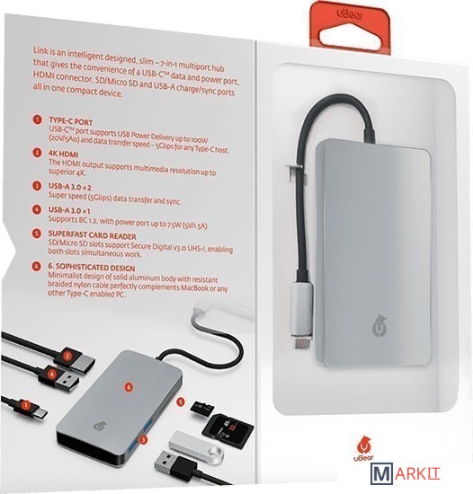 КОМПАКТНЫЙОдин из самых компактных адаптеров на рынке. Его размеры всего 10x7x1,5 см. Идеален для ежедневного использования, а также путешествий.СКОРОСТЬ РАБОТЫСкорость передачи данных: Хаб имеет 3 порта работающие по протоколу USB Super Speed USB 3.0 с высокой скоростью передавать данные, до 5 Гбит/c. Максимальная скорость зардки благодаря порту USB-C Power Delivery вы сможете быстро заряжать ваш MacBook на мощности до 100 ВТ.HDMI 4KС LINK 7-в-1 Вы можете с легкостью смотреть видео в высоком разрешении 4K. Продвинутый разъем HDMI поддерживает передачу медиафайлов с разрешением 4K x 2K при частоте 30 Hz.ДИЗАЙН И МАТЕРИАЛЫАлюминиевый корпус адаптера идеально дополняет MacBook по форме и цвету. Стильный кабель в тканевой оплетке обеспечит надежное и безопасное подключение вашего устройства. Идеальная эргономика, компактность и функциональность.НАДЕЖНЫЙВсе порты будут работать стабильно, не прерываясь даже под самой высокой нагрузкой, благодаря качественным комплектующим. Гарантируем надежность и долговечность. Срок службы не менее 5 лет.USB-C выход: одновременная передача данных по протоколу USB 3.0 (5Gbps) и зарядка PD до 100Вт (20В/5А)USB-С х 1 для передачи данных и зарядки до 100 Вт (20V/5A)USB-A х 1 поддержка BC 1.2, с возможностью зарядки до 7.5 Вт (5В/1.5А)HDMI: разрешение до 4Kx2K@30Hz