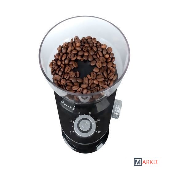 съемный контейнер для молотого кофепротивоскользящие ногиобласть намотки шнура в основаниибольшая прозрачная емкость для кофе в зернах емкостью 250 гконтрольная лампазащита от случайного включенияпрочный моторпрочные и надежные фрезыпрактичная регулировка уровня помолаудобная регулировка количества молотого кофе - от 2 до 12 чашекмощность: 200ВтГабариты: 26,8 х 18,7 х 13 смВес нетто 1,40 кг