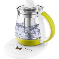 Электрический чайник с сенсорным управлением КТ-6130 является универсальным прибором для приготовления не только напитков, но и пищи. Помимо кипячения, прибор греет воду до заданной t, а также имеет специальные программы для приготовления различных блюд.Чайник греет воду от 40 до 100 °С с шагом 5 °С, что очень удобно при заваривании разных сортов чая или приготовления детского питания. Вы можете настроить необходимую t сами либо выбрать для этого режим (травяной, ароматизированный или черный чай).В комплекте идёт чаезаварочный фильтр для заваривания чая прямо в чайнике. Вам нужно только засыпать листья в фильтр, залить воду и выбрать t или режим. Фильтр легко снимается, моется и устанавливается обратно.У КТ-6130 имеется 11 предустановленных программ приготовления различных блюд и напитков: варка супа, каши, спагетти, круп, подогрев молока и тд. Также есть функция поддержания t и автозапуска, которые можно использовать одновременно.В комплекте идёт подставка для 6 яиц, а у чайника есть специальный режим для их варки. Программа доводит воду до кипения, а затем поддерживает кипение, нагревая воду на мощности 500 Вт в течение 8 минут.На подставке расположена панель управления, кнопки вкл/выкл, кнопки выбора программ, кнопки включения и поддержания t и автозапуска, а также LED-дисплей. На ярком дисплее отображается t воды и время.Чайник КТ-6130 отлично подойдёт для тёплых встреч с семьёй и друзьями. За один раз в чайнике можно вскипятить до 1,8 л воды. Этого хватит, чтобы приготовить горячие напитки на большую семью. Ручка чайника пластиковая, не нагревается и удобно лежит в руке.Корпус и крышка чайника выполнены из стекла, а подставка – из сочетания стекла и пластмассы. Мерная шкала нанесена на прозрачную часть корпуса. Съемная крышка и широкое горлышко облегчает доступ внутрь при мойке и во время удаления накипи.Подставка с центральным контакт даёт возможность располагать на ней чайник в любом положении, обеспечивая вращение на 360°. Имеется защита при закипании, при включения чайника без воды.