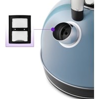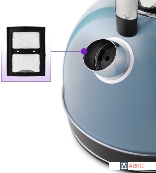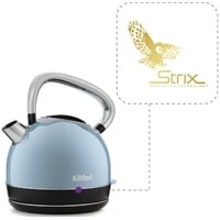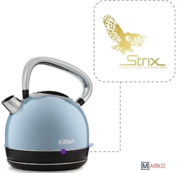 В носике чайника расположен съёмный фильтр, который задерживает частички накипи и предотвращает их попадание в чашку.Чайник оснащён контроллером Strix. Он устраняет риски короткого замыкания и возгорания прибора. Обеспечивает защиту при закипании, при включении чайника без воды и при снятии с базы во время работы.