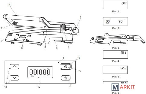 LCD-дисплей;Открытие крышки на 180°;Съёмные моющиеся пластины с антипригарным покрытием;Раздельная, плавная регулировка температуры верхней и нижней панелей;Регулировка расстояния между пластинами по высоте продукта;Корпус из высокопрочного пластика, декорирован нержавеющей сталью;Защита от перегрева.