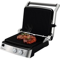 Открытие крышки на 180°;Защита от перегрева;Съёмные моющиеся пластины с антипригарным покрытием;Регулировка расстояния между пластинами по высоте продукта;Корпус из высокопрочного пластика, декорирован нержавеющей сталью;Вертикальное хранение для компактного размещения на кухне.