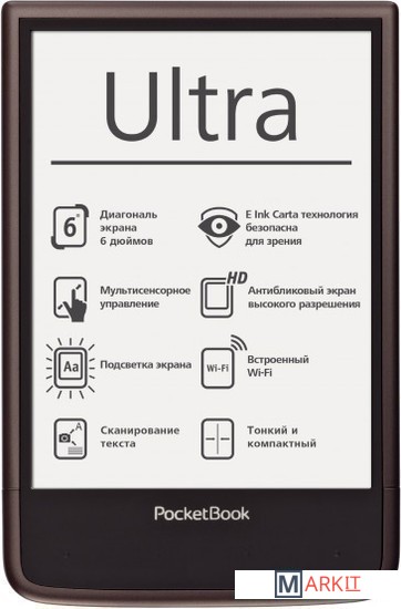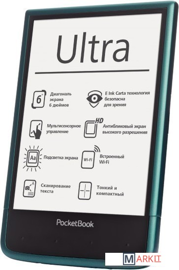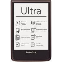 E Ink ридер со встроенной камерой – PocketBook Ultra. Оснащен дисплеем поколения E Ink Carta с HD разрешением 1024 x 758 пикселей и 212 dpi. На тыльной панели PocketBook Ultra расположена 5 Мп камера с автофокусом и встроенной диодной вспышкой. Поддерживает более 20 популярных текстовых и графических форматов, а также содержит набор предустановленных словарей ABBYY Lingvo.