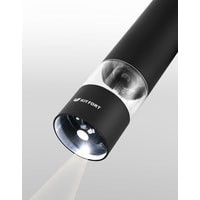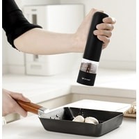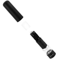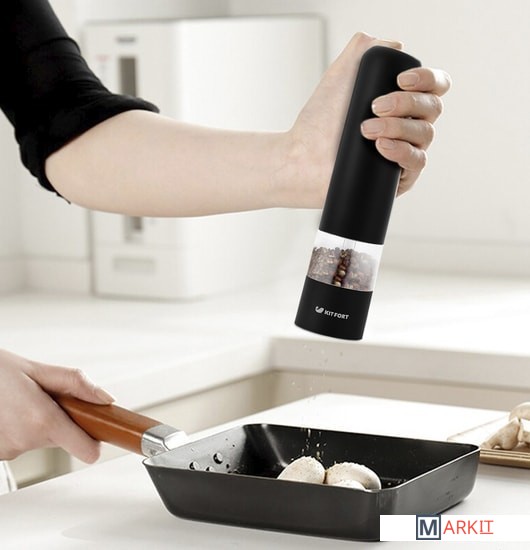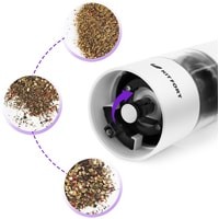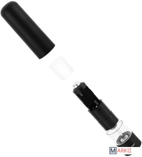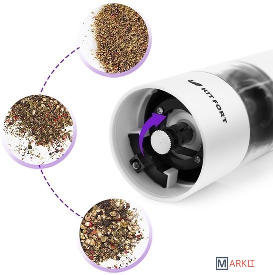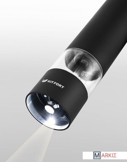 Степень помола легко регулируется винтом. Мельница удобно лежит в руке, включается одной кнопкой и работает от 4 батареек типа АА. Во время помола снизу загорается светодиод, он освещает блюдо, чтобы было лучше видно количество специй.