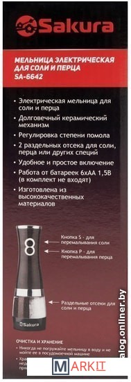 Керамический механизмРегулировка степени помола2 отсека: соль, перец и других специй.