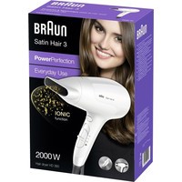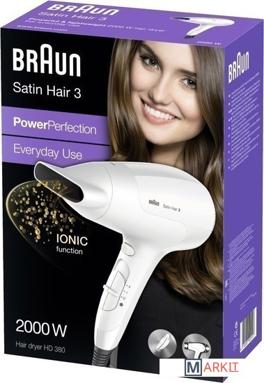 Braun HD 380 – легкий фен в эргономичном дизайне для идеальных образов без потери времени. Мощный прибор с технологией ионизации воздуха создает стильные укладки и укрощает даже непослушные волосы, склонные к электризации.Прибор серии Satin Hair 3 работает в трех температурных режимах. Высокая и средняя температура разработаны для быстрой сушки и укладки. Функция холодного обдува добавлена в модель 380 для закрепления прически. Пользователь также может выбирать интенсивность воздушного потока. Благодаря технологии Dry Safe и усовершенствованным лопастям фен синхронизирует мощность воздуха и температуру нагрева для максимальной защиты прядей от сухости.Технология ионизации придает волосам здоровый блеск и зеркальную гладкость. Функция IONIC позволяет прибору немецкого бренда обволакивать каждый волосок отрицательно заряженными ионами и нейтрализовать статическое электричество. Инновационная система также насыщает пряди влагой, приглаживает непослушные волоски и делает их более мягкими. Функцию IONIC дополняет технология инфракрасного нагрева. Она отвечает за равномерное распределение горячего воздуха без тепловых пятен и быструю сушку головы без повреждения волосяных фолликул.Модель HD 380 создана для компактного использования. Сетчатый фильтр предотвращает попадание волосков в мотор прибора и его перегрев. Насадка также защищает волосы от спутывания и позволяет поворачивать фен во время сушки на 360 градусов и держать его под любым удобным углом. Узкое сопло продукта Braun концентрирует воздушные потоки и с высокой точностью направляет их на определенные участки. Уникальное строение насадки предназначено для профессиональной укладки в домашних условиях.