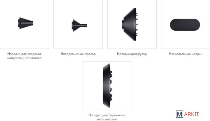 В комплекте:- нескользящий коврик;- насадка-диффузор;- насадка-концентратор 2 шт;- насадка для бережного высушивания.