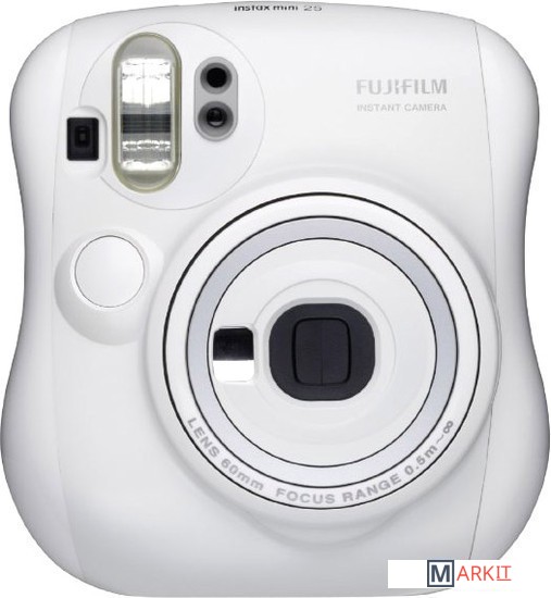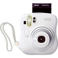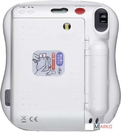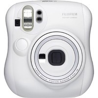 Портативная пленочная камера в белом корпусе, предназначенная для мгновенной печати на пленке Instax Mini (62 x 46 мм). Оснащена двумя кнопками спуска (для горизонтальной и вертикальной ориентации), вспышкой, небольшим зеркальцем, кнопками компенсации экспозиции и выбора режима "портрет/пейзаж". В комплекте - линза-насадка для съемки на близком расстоянии.