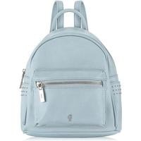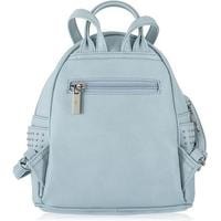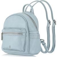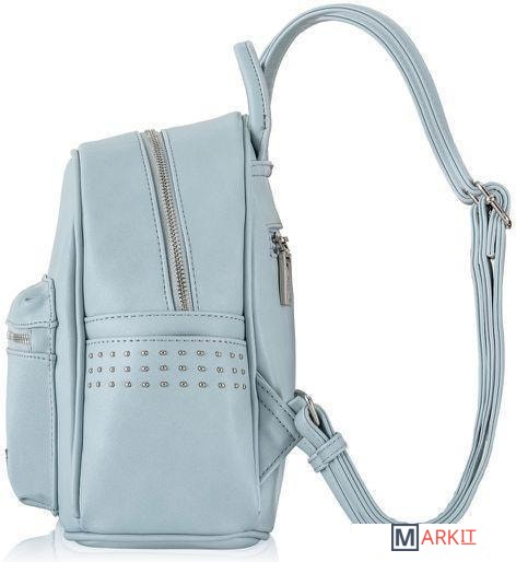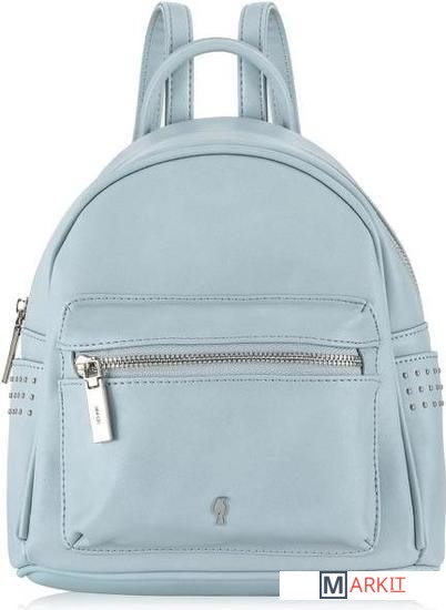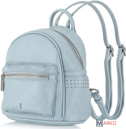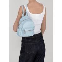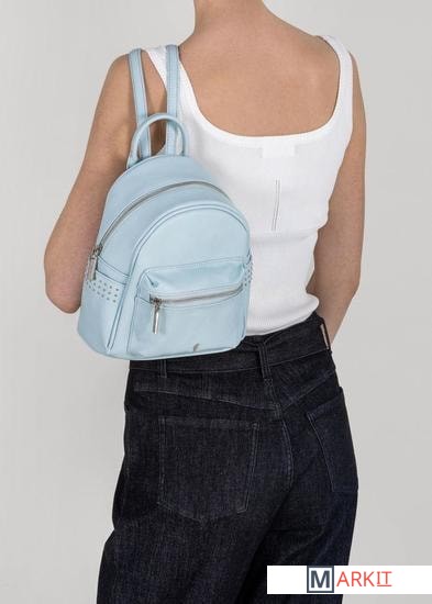 Небольшой женский рюкзак из матовой экокожи небесно-голубого цвета для повседневного ношения. Его можно носить как сумку - для этого предусмотено наличие ручки. Также удобно ношение на плечах, так как лямки регулируются по длине. Внутри один карман на молнии и три открытых кармана. Есть внешние боковые открытые карманы, отделанные тремя рядами плоских кнопок и карман на спинке на молнии. Максимальная длина лямки - 95 см.