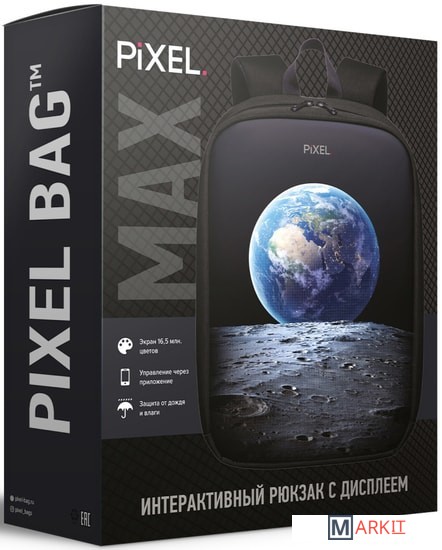 Рюкзак сделан из влагоотталкивающей ткани и имеет плотную внутреннюю подкладку для защиты содержимого от ударов.Металлическая молния полностью скрыта для защиты от попадания воды, грязи, а также для предотвращения взломов и краж.Экран интегрирован в ткань и не имеет выраженных границ, за счет чего в выключенном состоянии его не видно. Размер экрана- 25x25см, и он отображает 16,5 миллионов цветов.Лаконичный дизайн делает MAX универсальным рюкзаком как для детей, так и для взрослых. Подключение к устройству через Wi-Fi.Работа экрана от Power-банка (в комплект не входит).Экран гибкий, защищен от воздействия влаги.