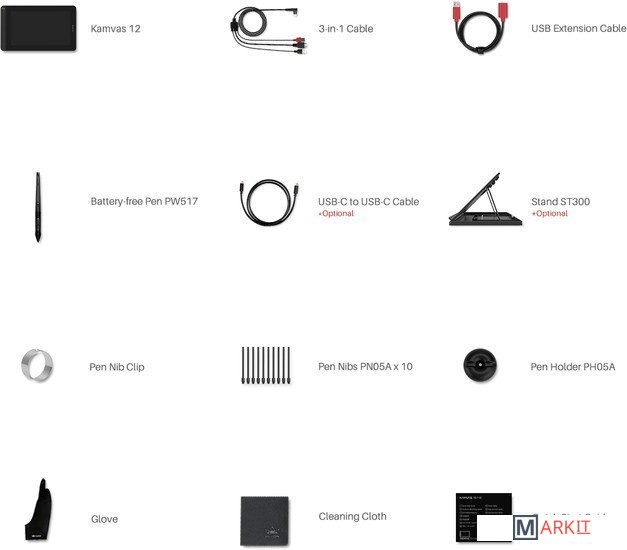 Комплект поставки - цифровое перо PW517- наконечники для пера PN05A (10 шт.)- подставка для пера PH05A- клипса для извлечения наконечников- кабель USB Type-C- кабель 3-в-1- документация