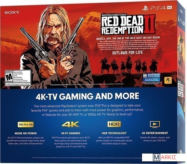 • Консоль PlayStation 4 Pro• Беспроводной геймпад Dual Shock 4• Моногарнитура• Кабель питания• HDMI-кабель• USB-кабель• Игра Red Dead Redemption 2Вертикальная подставка в комплект не входит!