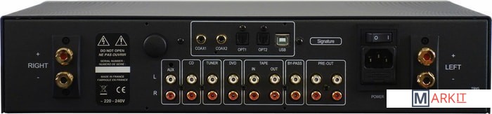 Панель с цифровыми интерфейсами на задней стороне приобретается отдельно.Усилитель Atoll IN 200 Signature Black имеет пять линейных входов, один из которых, дополненный выходом, предназначен для мониторинга записи на подключенном записывающем устройстве. Предусмотрена возможность включения аппарата в систему домашнего кинотеатра, для чего он имеет дополнительный байпасный вход. Также Atoll IN 200 Signature Black оснащен двумя выходами с предусилителя для подключения внешних оконечников, а также триггерным управляющим выходом. Имеет аппарат и гнездо для подключения наушников.Выходные каскады Atoll IN 200 Signature Black построены по симметричной схеме на дискретных элементах, с парными MOS-FET транзисторами. Благодаря значительному выходному току Atoll IN 200 Signature Black легко справляется с работой с акустикой даже со сложной характеристикой импеданса.