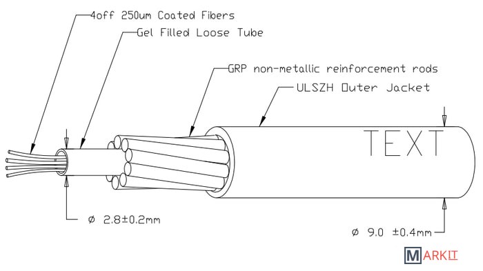 Оптоволоконный кабель, 4-волоконный, 50/125 OM2.Максимальная потеря 3.5/1.0 дб/км (850/1300 нм).Пропускная способность 500/500 (850/1300 нм).