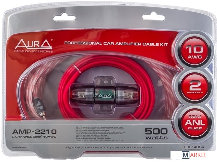 Комплект для подключения 2-х канального усилителя.Силовой кабель 10AWG (6мм2) красный — 5 метров.Силовой кабель 10AWG (6мм2) черный — 1 метр.Колба MiniANL + предохранитель 30A.RCA-кабель: 5 метров, 2 канала, витая пара (RCA-A150 MkII).Акустический кабель 16AWG (2×1,5мм2) — 10 метров.Провод «remote» 18AWG (0,75мм2) синий — 5 метров.Клемма кольцевая для силового кабеля сечением 10AWG (6мм2): 2 шт.Клемма U-образная для силового кабеля сечением 10AWG (6мм2): 2 шт.Шестигранник.Стяжки — 10шт.