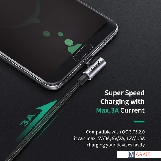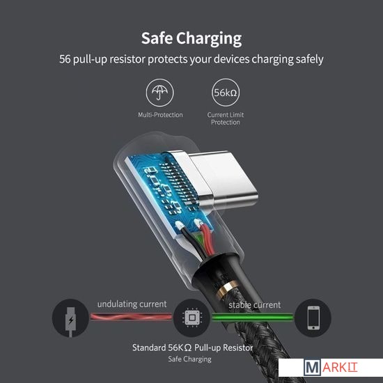 Кабель поддерживает быструю зарядку QC 2.0/3.0 (5В 3А, 9В 2А или 12В 1.5А).Кабель оборудован встроенным резистором 56 кОм гарантирует надежную проводимость и зарядку, защищая устройства от повреждений из-за чрезмерной силы тока.