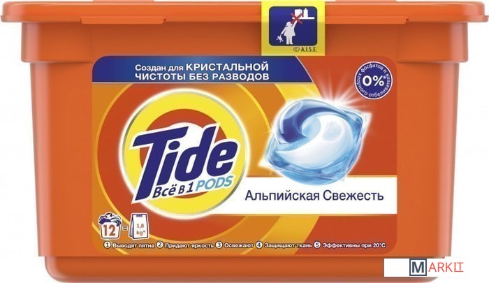 Капсулы для стирки TIDE Всё в 1 Альпийская свежесть — это потрясающая эффективность всего в одной капсуле. Кристальная чистота и никаких следов. Попробуйте инновационное средство для стирки от Tide — Tide ВСЁ в 1 PODS. Каждая капсула состоит из 3 секций — таким образом, ее ингредиенты не смешиваются до начала стирки. При контакте с водой специальная инновационная пленка растворяется, и капсула начинает свое действие: очищает, удаляет пятна, придает яркость и освежает; она эффективна уже при 20 °С. Одной капсулы хватает, чтобы полностью выстирать полный барабан грязных вещей. Tide ВСЁ в 1 PODS — это надежный выбор для удивительно эффективной стирки. Используйте вместе с кондиционерами Lenor, которые придают белью еще больше мягкости и свежести. ВНИМАНИЕ. Продукт может быть опасен. Берегите капсулы Tide от детей.Состав: >30% Анионные ПАВ, 5-15% Мыло,
