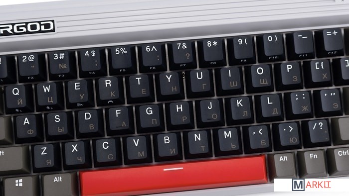 КЛАВИАТУРА БЕЗ КИРИЛЛИЦЫТип: тактильный Сила нажатия: 55 грамм (средние)Длина пути: 4 мм (2 мм до срабатывания)Помимо подключения через стандартный кабель USB клавиатура может работать в одном из двух беспроводных режимов — Bluetooth 5.0 или беспроводном соединении 2.4G, обладающем меньшей, по сравнению с Bluetooth, задержкой. Переключение между режимами осуществляется с помощью специального слайдера в верхней правой части. Благодаря беспроводному подключению вы также можете подключить клавиатуру к устройствам на iOS или Android.Два кабеля в комплекте - Вы можете использовать как USB Type-C, так и старый добрый USB Type-A.Мультимедиа и дополнительные FN функции - Клавиатура поддерживает сочетания клавиш для регулировки громкости и управления музыкой. Также имеется возможность отключить кнопку Windows.Durgod Zeus Engine позволяет создавать макросы. Можно создать свои мультимедиа, функциональные макросы и многое другое. ПО не поддерживается на Mac OS.Прочные регулируемые ножки позволят немного приподнять клавиатуру и изменить её угол наклона для более комфортной печати, а их прорезиненное дно не даст клавиатуре сдвинуться с места.Функция Full N-key Rollover по USB (NKRO) - Позволяет нажимать одновременно неограниченное количество клавиш. Для печати идеально подойдет как 6KRO, так и NKRO, независимо от вашей скорости. Для игр NKRO будет плюсом и неважно, нажимаете ли вы больше 6 кнопок или нет, поскольку, играя в любую игру, вы можете случайно нажать пару лишних клавиш и из-за этого клавиатура может не среагировать на нажатие, которые вы хотели совершить изначально. Осторожно, старые BIOS-ы могут не реагировать на клавиатуру из-за NKRO.