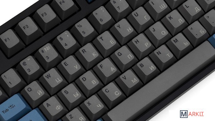 КЛАВИАТУРА БЕЗ КИРИЛЛИЦЫТип: линейныйСила нажатия: 60 грамм (тяжелые)Длина пути: 4 мм (2 мм до срабатывания)Данная модель выполнена в сочетании пурпурно-фиолетового, серого и чёрного цветов, расцветка обязательно понравится любителям сочных, но приглушённых красок. Клавиатура собрана добротно и монолитно, а сочетание высококачественных double-shot PBT клавиш с переключателями Cherry MX и звукопоглощающей подложкой позволяет сделать печать на клавиатуре максимально тихой (насколько это возможно для механики). Mini-USB порт спрятан в центре под корпусом, а на самой клавиатуре имеются центральная и две боковые канавки под кабель.Клавиатура поддерживает сочетание клавиш для регулировки громкости и управления музыкой, также имеется возможность переключения между 6KRO и NKRO.DIP-переключатели на задней панелиДают возможность поменять местами функции кнопок Ctrl и Caps Lock, Windows и Alt, Windows и Fn или отключить Windows.Звукопоглощающая подложкаПоглощает звуки при нажатии, делая процесс печати более тихим по сравнению с обычными механическими клавиатурами.Низкопрофильные клавиши Step-Sculpture2Данные клавиши заметно ниже и имеют оптимальный угол наклона, из-за чего, по отзывам, печатать приятнее и комфортнее, чем на более высоких клавишах.Клавиатура совместима с Mac OSFN-слой работает (кроме клавиш F6, F8, F9), а поменять местами клавиши-модификаторы можно в системных настройках. Проверено с MAC OS 10.13Функция Full N-key Rollover по USB (NKRO)Позволяет нажимать одновременно неограниченное количество клавиш. Для печати идеально подойдет как 6KRO, так и NKRO, независимо от вашей скорости. Для игр NKRO будет плюсом и неважно, нажимаете ли вы больше 6 кнопок или нет, поскольку, играя в любую игру, вы можете случайно нажать пару лишних клавиш и из-за этого клавиатура имеет шанс не среагировать на нажатие, которое вы хотели совершить изначально. Имеется возможность переключения между NKRO и 6KRO через FN сочетания.