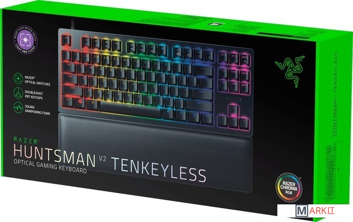 Клавиатура с непревзойденной скоростью отклика еще никогда не была такой стройной. Встречайте Razer Huntsman V2 TKL — оптическую игровую клавиатуру без цифрового блока (Tenkeyless), со сниженным шумом, практически нулевой задержкой входного сигнала и оснащенную различными высококлассными функциями. Компактный форм-фактор этой клавиатуры сочетается с ее полноразмерной функциональностью.Быстрее, легче и надежнее традиционных механических переключателей, и поддерживают реальную частоту опроса до 8000 Гц для более низкой задержки ввода. Доступны в двух вариантах — Линейные (Red) и Щелкающие (Purple).КЕЙКАПЫ ИЗ PBT ДВОЙНОГО ЛИТЬЯЭти колпачки для клавиш прочнее и долговечнее, чем из АБС-пластика. Их поверхность не сотрется до блеска, а обозначения на клавишах будут вечно новыми благодаря двухкомпонентному процессу литья.ЗВУКОПОГЛОЩАЮЩАЯ ПЕНАВнутри корпуса клавиатуры Razer Huntsman V2 TKL имеется слой особой пены, чтобы поглощать любой лязгающий шум, который может возникать при сильном нажатии на клавиши.СЪЕМНЫЙ КАБЕЛЬ USB-CПереноси, подключай и играй на клавиатуре с комфортом на любых LAN-соревнованиях и турнирах. Защелка кабеля гарантирует, что он будет надежно подключен во время игры.ГИБРИДНАЯ ВСТРОЕННАЯ ПАМЯТЬ И ОБЛАЧНОЕ ХРАНИЛИЩЕБудь готов к игре в любой ситуации, благодаря возможности сохранить и активировать до 5 профилей во встроенной памяти, одновременно создавая библиотеку макросов и настроек для использования с облачным хранилищем.