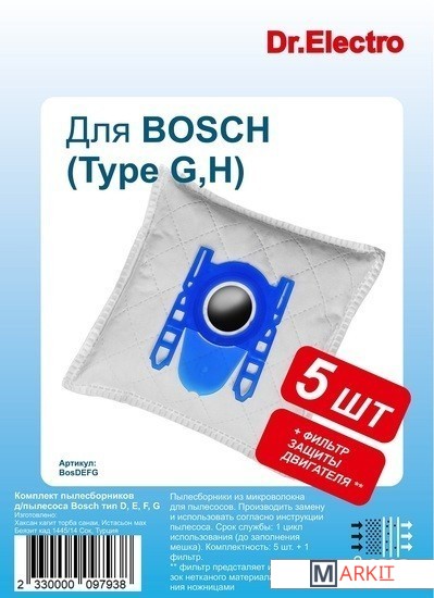 Комплектация Мешок для пылесосов Bosch серий D, E, F, G: 5 шт. Фильтр защиты двигателя – 1 шт.
