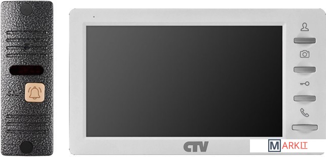 Комплект видеодомофона с 7" монитором с кнопочным управлением, записью фото и встроенным источником питания и вызывной панелью.