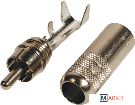 Это качественный разборный RCA разъем. Его корпус целиком выполнен из металла с никелированным покрытием.